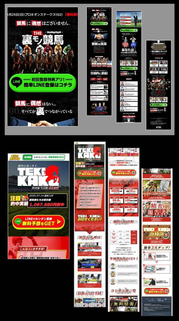 「競馬クイーン」という競馬予想サイトは、外部集客サイトからアクセスすると、広告コード付きURLを通じて「集客用LP」が表示されるが、コードを削除すると、印象の異なる非会員TOPページが現れる。外部サイト経由で強い演出と期待感を煽るページが「集客用LP」である一方、「通常版」はグループサイトでも同様の構成が確認でき、地味である。