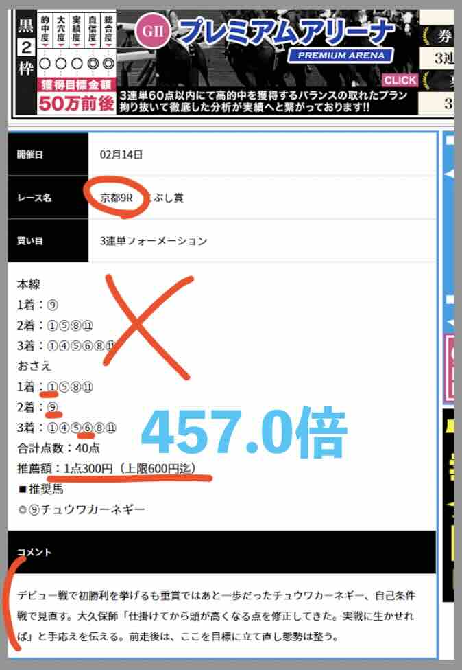 また、振込先口座の名義が「カ)オリオン」である点にも注目だ。同名義は他サイトでも確認されている。さらに、「カチウマの定理」の無料情報は買い目の提示がなく印を並べただけで、券種や点数は利用者任せだ。「無料予想」と呼ぶにはお粗末である。 実際に1日12レース提供される無料情報を4回分・計48レース検証した結果、大幅なマイナスとなった。