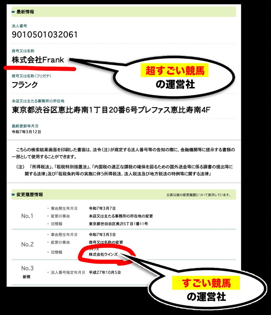 運営会社についても、「株式会社Frank」と表記されている一方で、国税庁サイトで確認すると旧サイトで使用されていた法人名との関係性が確認できた。