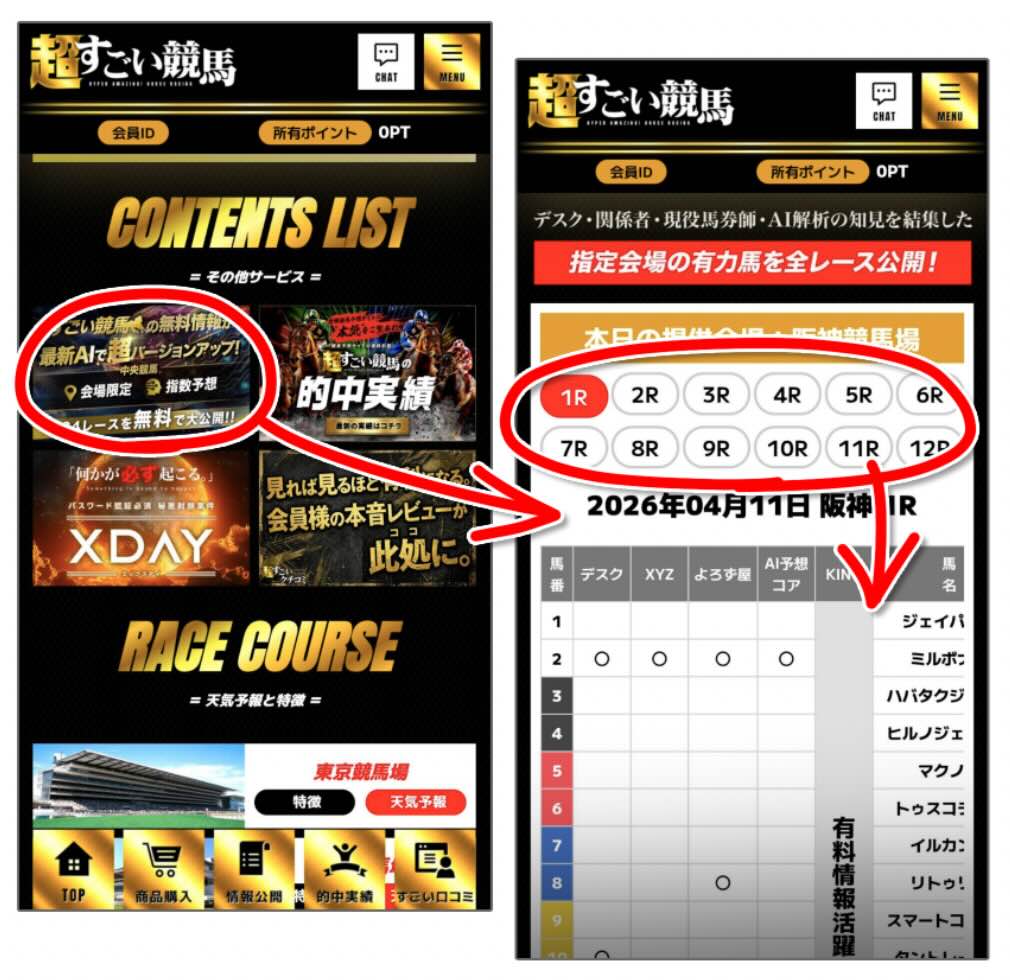 また、「超すごい競馬」の無料予想は全12レース分がまとめて提示される形式だが、券種や点数、資金配分といった具体的な指示はなく、最終的な取捨選択は利用者側に丸投げとなっている。そのため、情報量は多く見える一方で、どのレースを優先すべきか判断しづらく、実運用では扱いにくさが残る構成となっている。 -