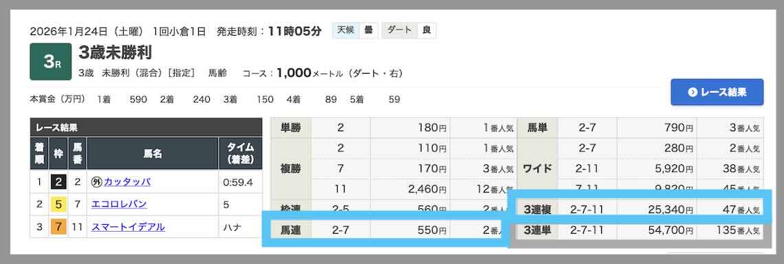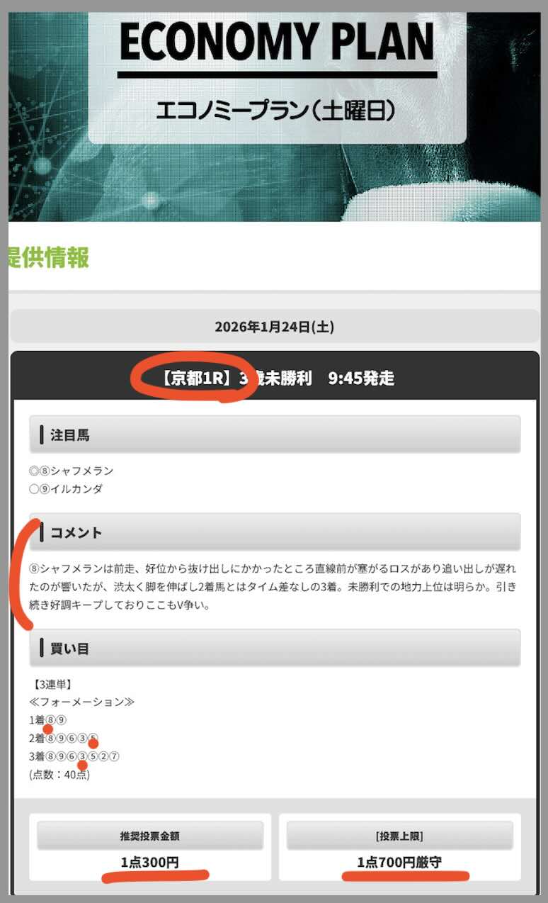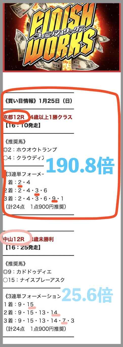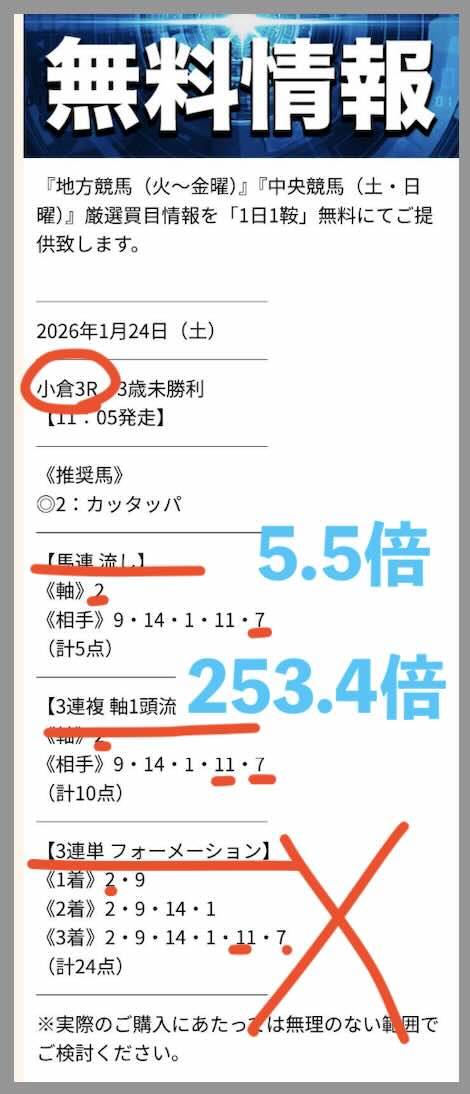 1/25は「精選2鞍」というコース(180pt)で小倉7Rにて539.9倍の的中となり、推奨金額で馬券購入した場合、600円が32万 3940円の獲得となった。