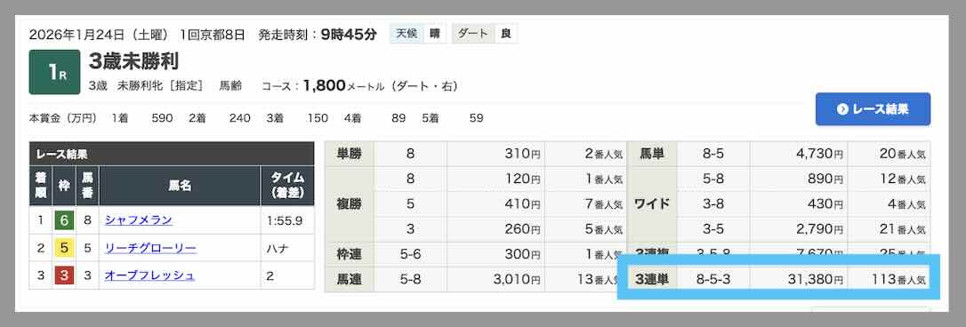 また同日、無料予想においても、5.1倍(馬連ガミ)・30.5倍(3複)・60.9倍(3単)と、2券種的中していた。