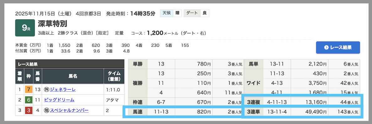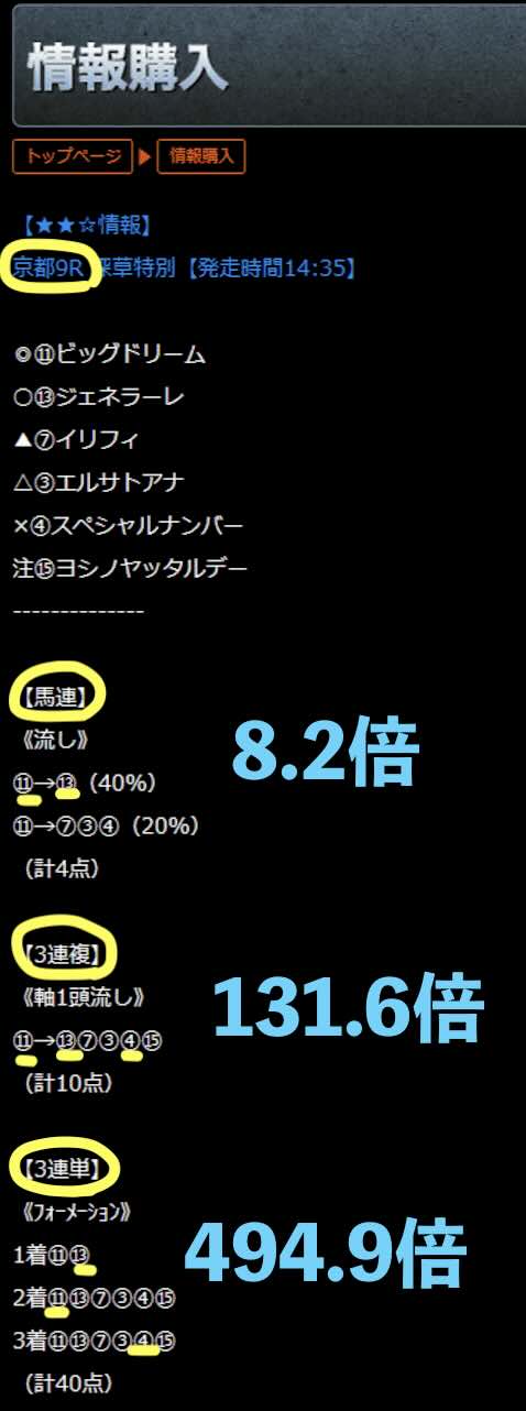 また同日、無料予想の方で、5.7倍(馬連)・21.5倍(3複)・75.6倍(3単)と、3券種がすべて的中していた。さすが。