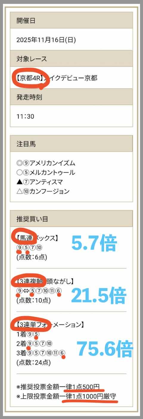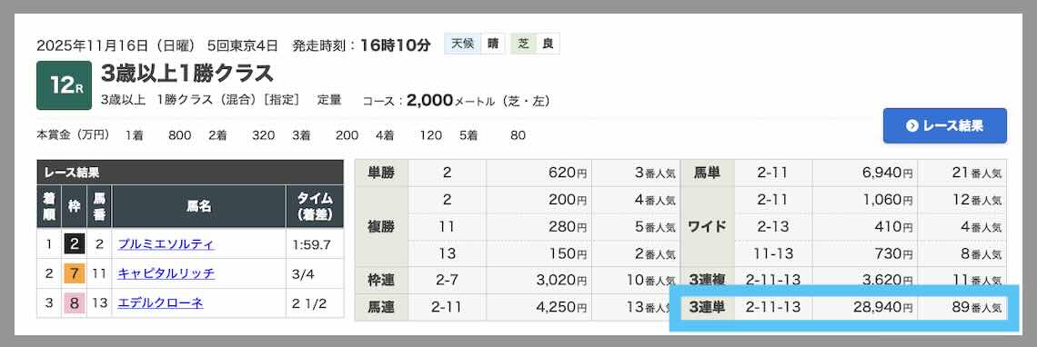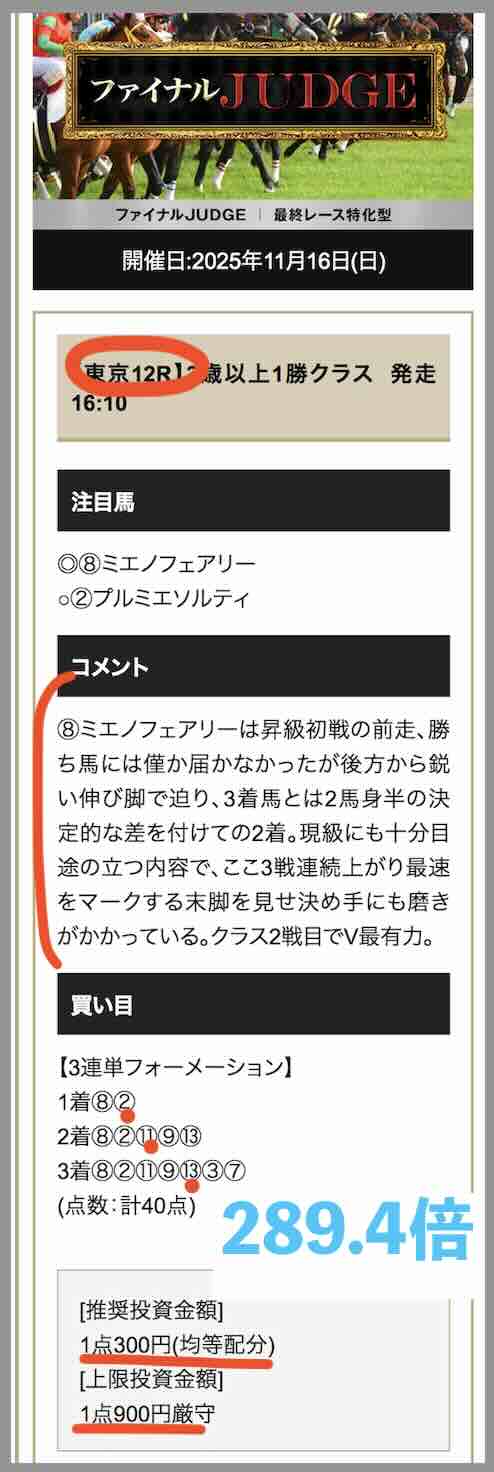 11/16は「ファイナルジャッジ」というコース(今回は230ptが割引で180ptだった)で東京12Rにて289.4倍の的中となり、推奨金額で馬券購入した場合、600円が26万 460円の獲得となった。