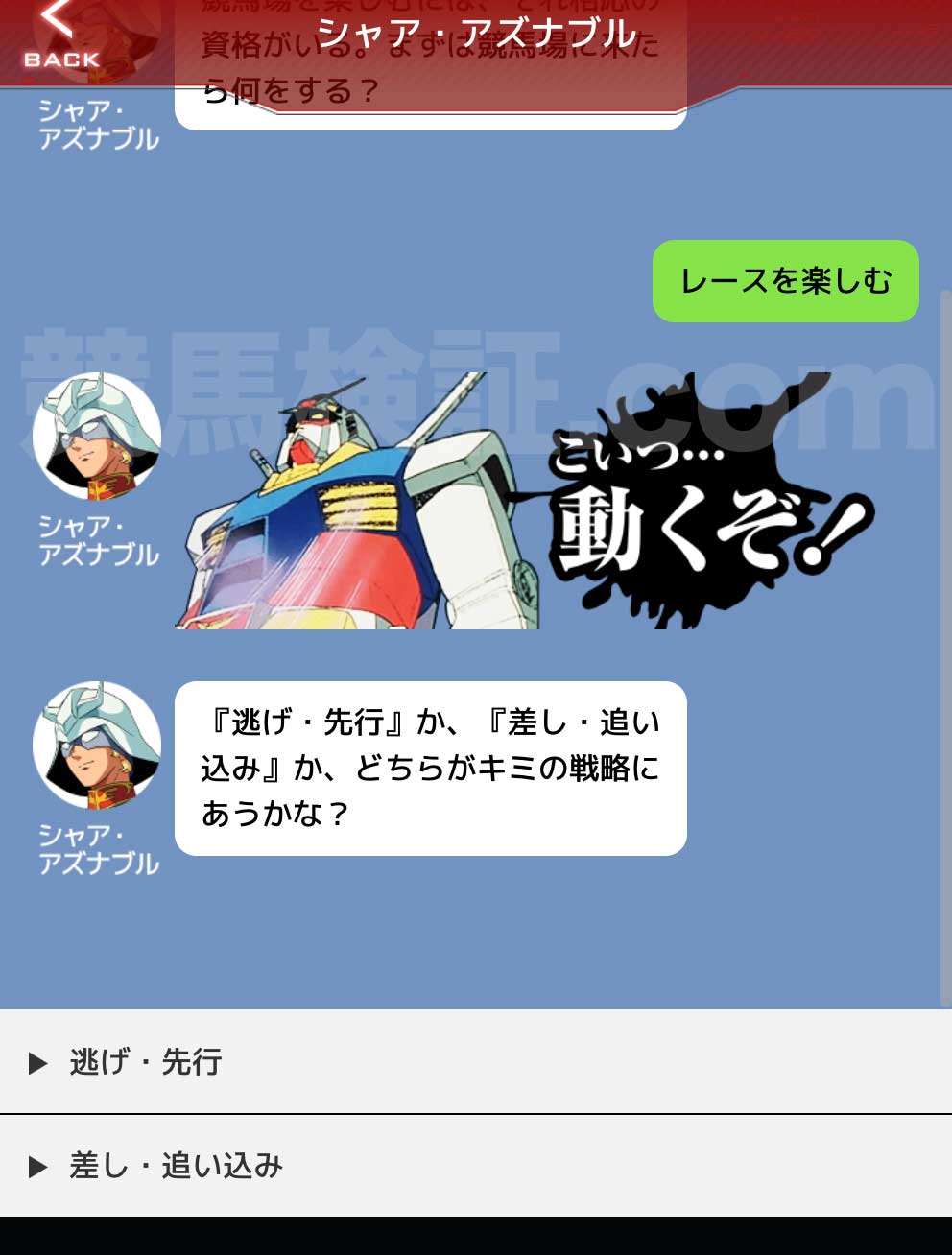 初めの2、3はシャアから競馬に因んだ質問があるのだが、途中からガンダムネタになり、8つくらい答えると最後に「君が能力を発揮できるのはこのタイプだ」と、シャアから自分に合った馬券の券種を薦められる。