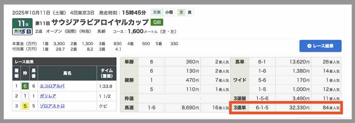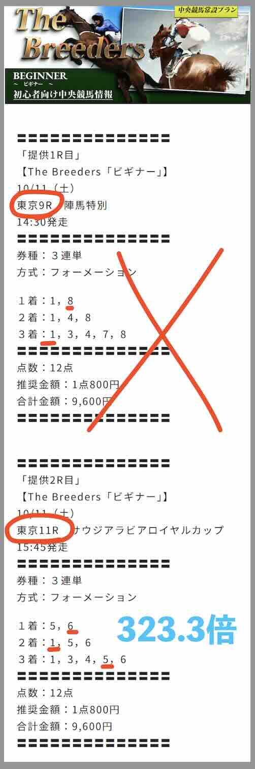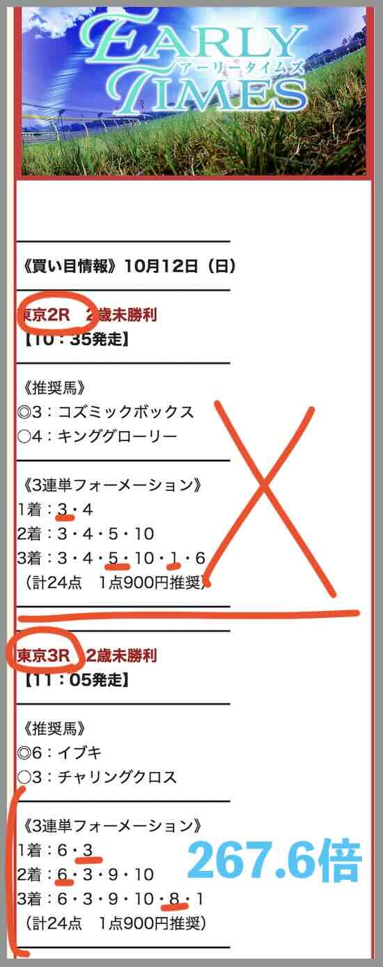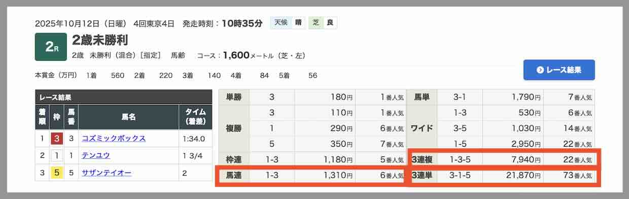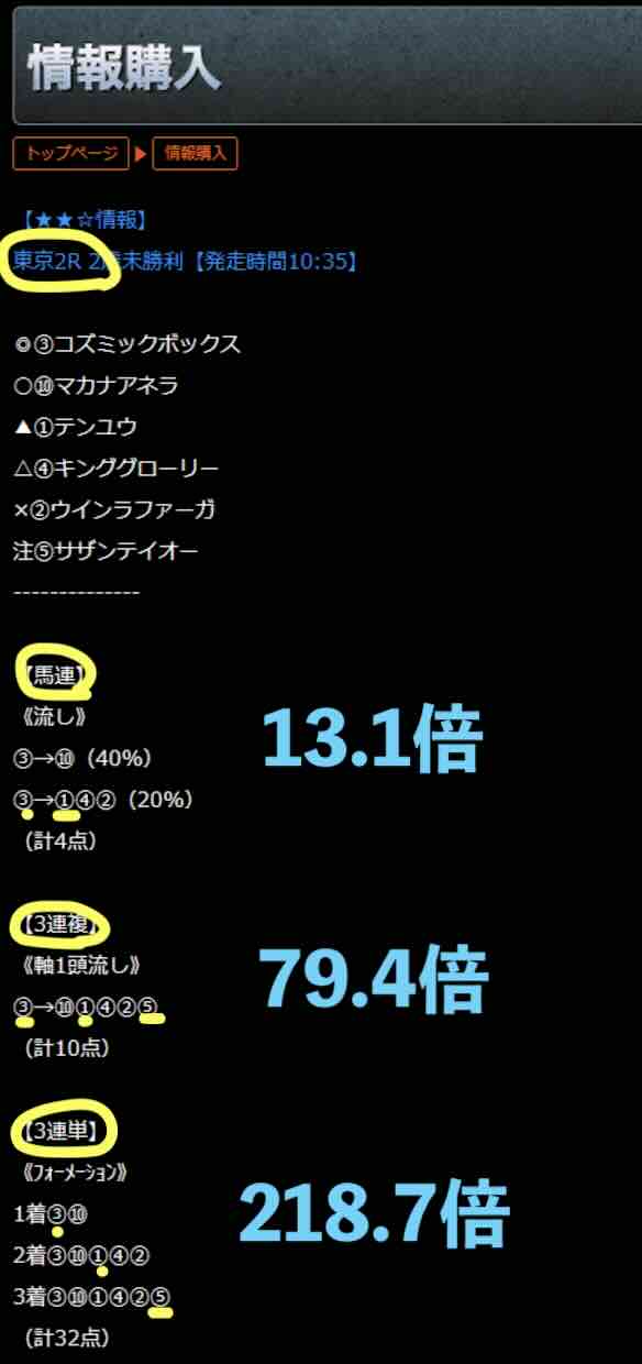 10/12にもなんと、わずか20pt予想(2000円)で参加できる超・安価な予想コースで、東京2Rにて218.7倍と、79.4倍、13.1倍の全3券種的中。仮に500円で全券種を買ってたら、今回は2000円予想で、15万 5600円の払戻しになった計算だ。