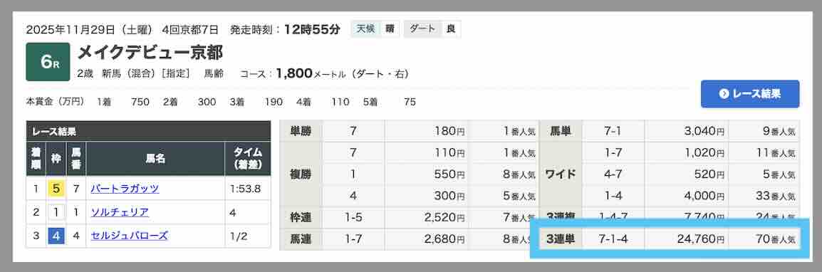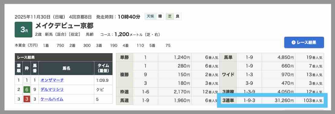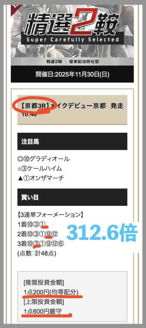 11/30にもなんと、わずか20pt予想(2000円)で参加できる超・安価な予想コースで、京都3R にて312.6倍と、40.5倍、19.6倍の全3券種的中。仮に500円で全券種を買ってたら、今回は2000円予想で、18万 6350円の払戻しになった計算だ。
