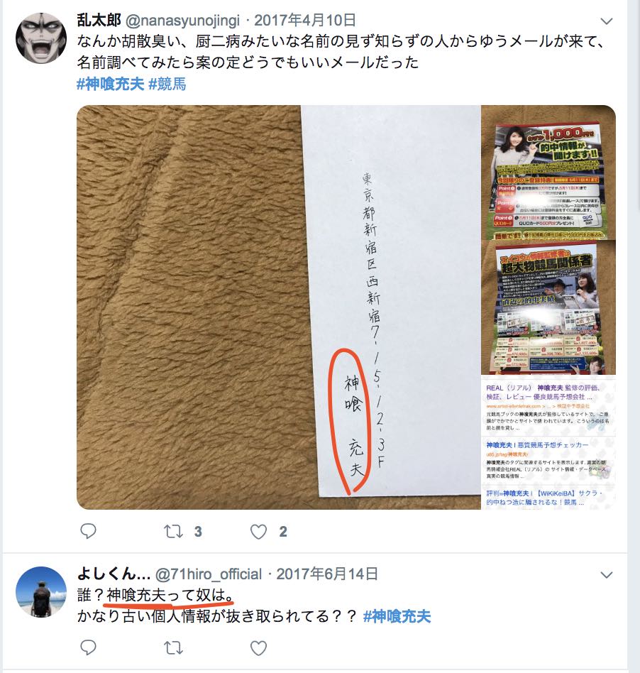 口コミによると競馬予想サイトの「株式会社エイコウ」からも「神喰充夫」というイタイ偽名の人物から、神話(株式会社神話)のDMとソックリなのが送られている。…とのことで、見ると送り主を手書きで書いてるのとか、ウケた(笑)