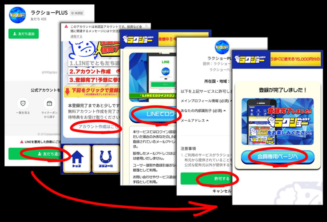 ページが切り替わったら(上画像参照)「アカウント作成はこちら」と書かれたテキストリンクを押す。ラクショープラスにメアドを開示していいかと確認画面になるので「許可する」を押すと「登録完了」となるので、「会員専用ページへ」を押すとラクショープラスの会員ページにログインすることができるようになる。