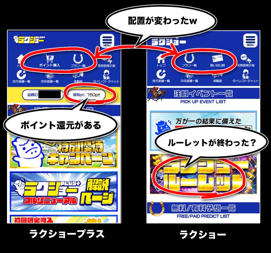 下画像では、左に「ラクショープラス」、右に「ラクショー」を並べて比較しているが、非会員TOPページ以上に、会員ページは見分けがつかないレベルで酷似している。