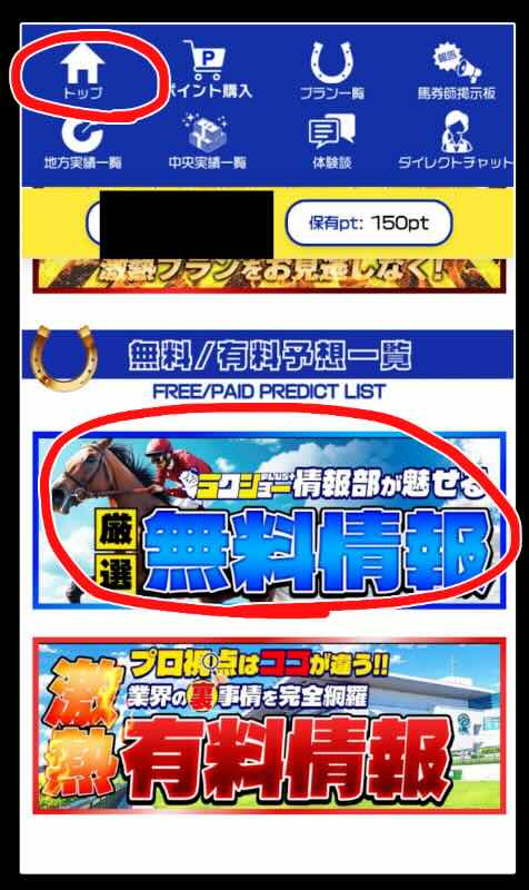 ラクショープラスの提供する、無料予想(無料情報)だが、会員TOPページを少し下に下がると「無料情報」とあるので、ここからラクショープラスの無料予想を確認できる。