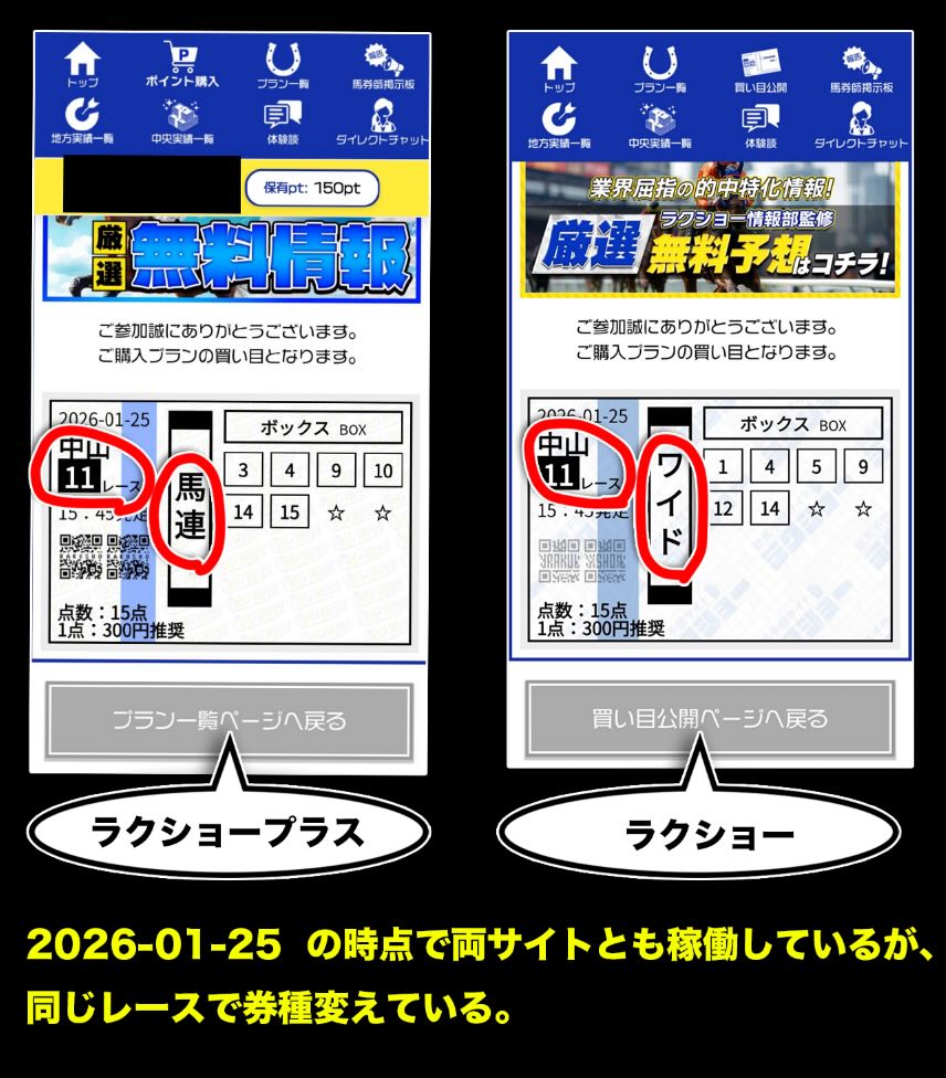 2026年1月25日の時点で、「ラクショープラス」がすでに公開されているにもかかわらず、旧「ラクショー」も引き続き無料予想を提供していた。