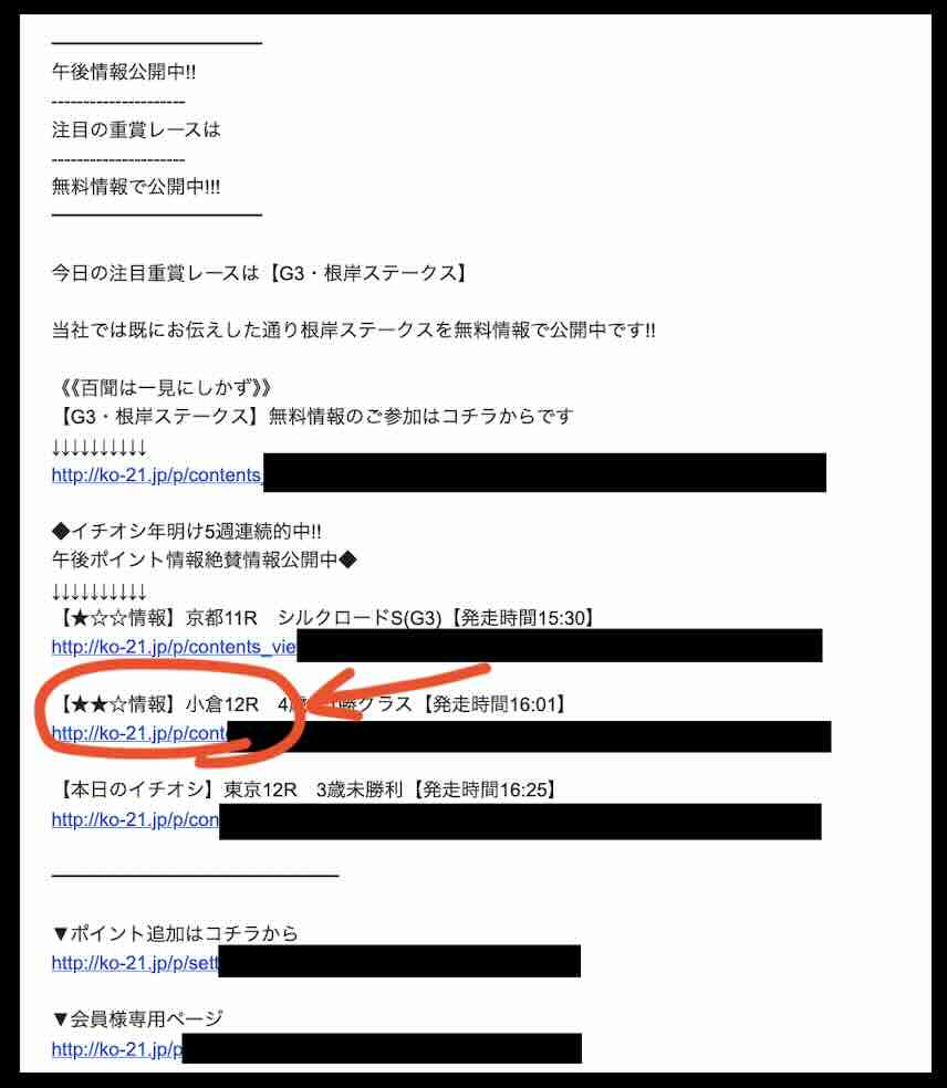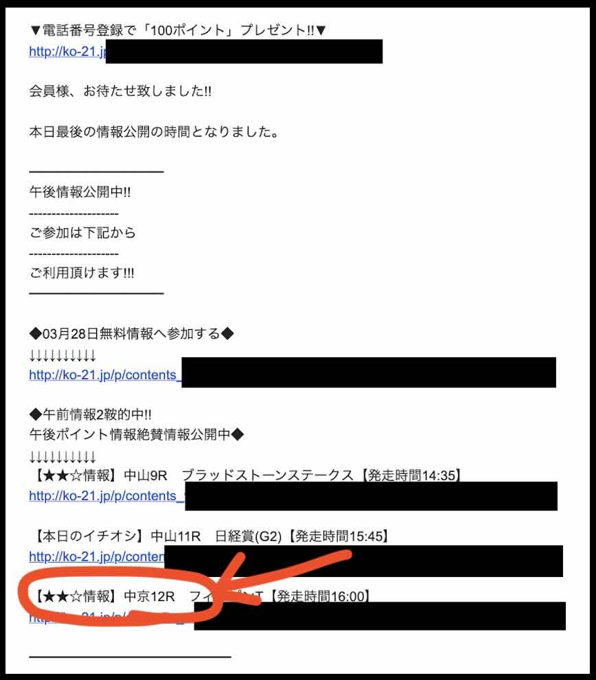 どうやら「未達」であればポイントは戻るようで、このようなプランをフックに客集めをしているサイトって他にも沢山あるが、大抵は「メールに誤操作があって送られていなかったけど、的中した」などと言ってポイントを返さないところが「ほとんど」だが、この「高配当21」の場合、本当にポイントバックして、さらに「迷惑料で100pt」追加してもらえたことに驚いた。