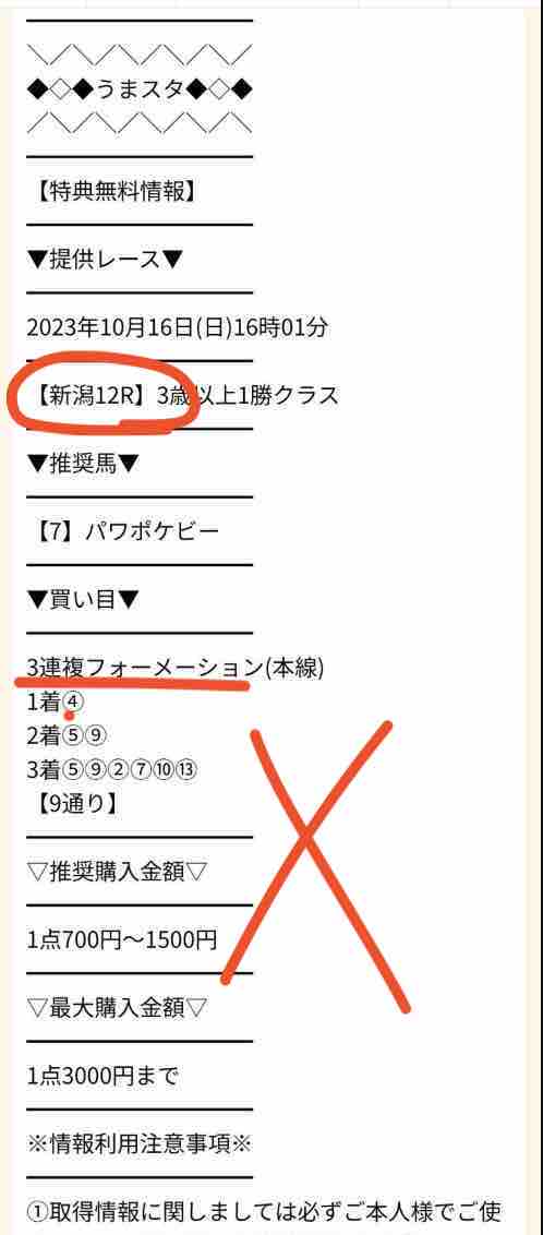以下、2023/10/28に提供されたうまスタの無料予想の検証結果である。うまスタの無料予想(無料情報)だが、検証するのは10/23の東京3R、3歳未勝利で提供された買い目。