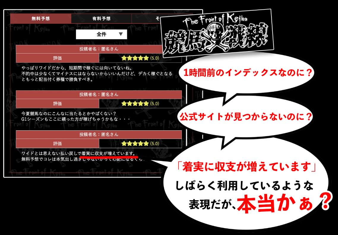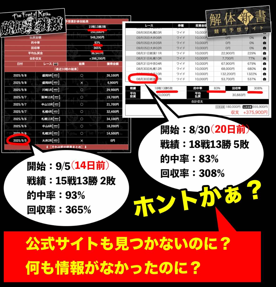 ところが、「競馬戦線」や「解体新署」といった、同一運営と推測される外部集客サイトでは、すでに14日〜20日も前からサラコレの検証を開始していたことになっており、その予想精度は回収率300%超えと主張されている。これが事実であれば、当然「優良」評価に値するはずである。