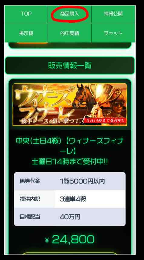 サラコレが販売している競馬予想は、会員ページのメニューボタンに「商品購入」とあるので、ここが「サラコレ」の提供するコース一覧となる。