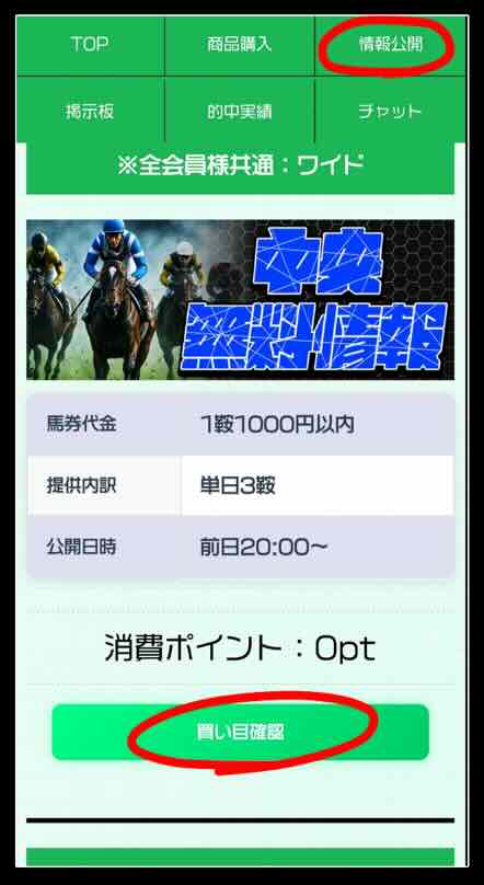 無料予想に参加して、買い目の公開時刻になったら、確認ができる。