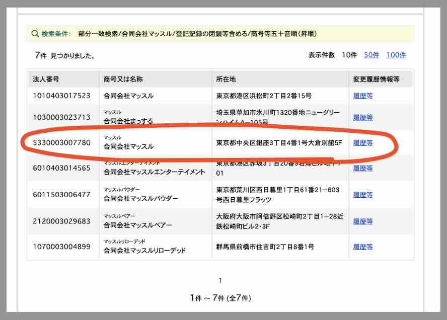 次に競馬2.0という競馬予想サイトが「合同会社マッスル」であることが判明した。そこで国税庁の法人番号公表サイトから検索を行ったところ、特商法ページに記載された住所と一致する法人が確認できた。