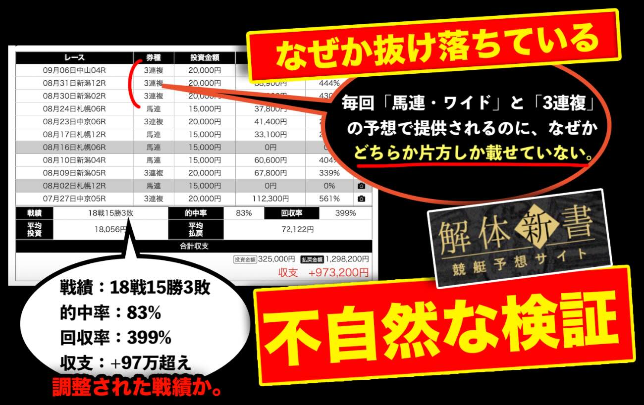 本来であれば公平な評価のため、毎回「馬連」と「3連複」の両方を対象にすべきだが、実際には的中した「片方」しか掲載していないように見受けられる。
