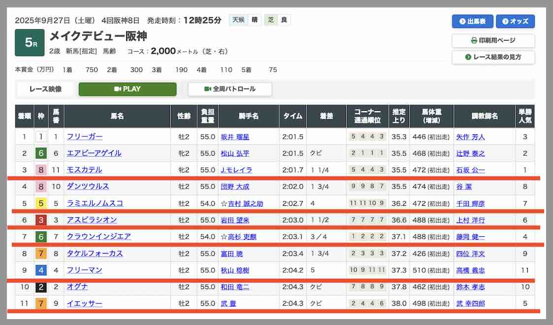 今回抜き打ちで検証した「R32」の無料予想(無料情報)は、2025年9月27日の阪神5Rで提供された買い目である。