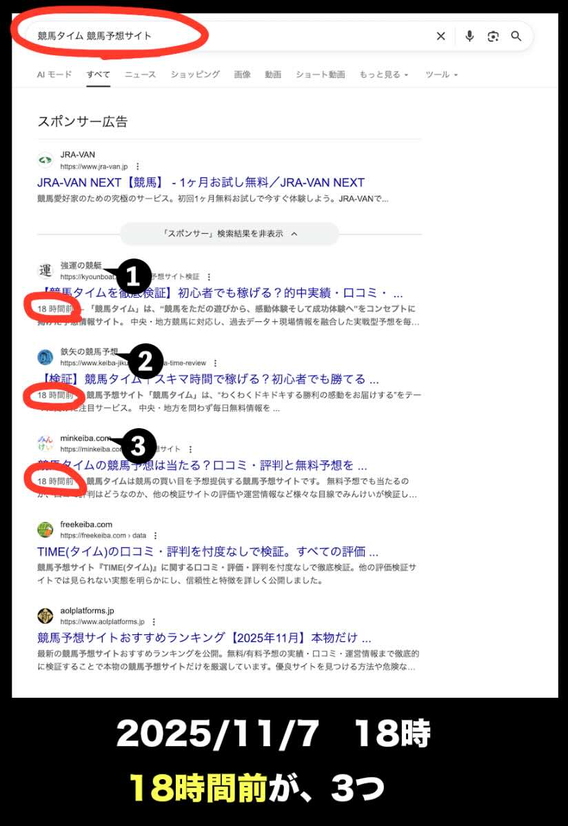 2025年11月7日の18時の時点で、「競馬タイム 競馬予想サイト」という複合キーワードで検索を行ったところ、すでに3つの情報サイトがGoogleにインデックス(検索エンジンに認識)されていることが確認できた。