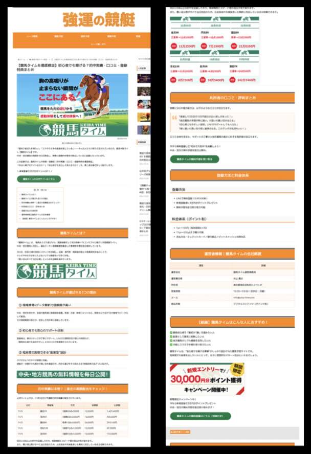 1番目に表示された「強運の競艇」と同じで、「競馬タイム」の基本情報を整理したもので、特に注目するような情報は載っていない。記事内容は、1番目の「強運の競艇」とほぼ同じで、構成・画像の扱いまで酷似している。実質的にはテンプレートを共有していると見られ、独自性のある検証とは言いがたい。