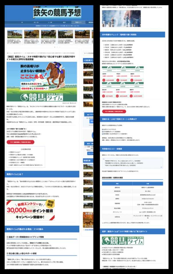 集客の面でも、公式サイトが検索結果にほとんど姿を見せない一方で、「強運の競艇」「鉄矢の競馬予想」「みんけい」といった情報サイトが、ほぼ同じタイミングで競馬タイムの記事を公開していたことが確認できた。