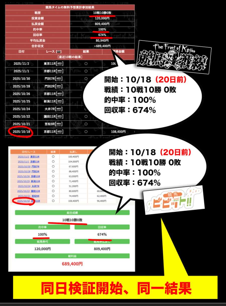 加えて、外部集客サイトがほぼ同じタイミングで競馬タイムのことを「見つけ」、同じ検証期間・同じ検証結果・同じ公開タイミングで記事を出している事実は、極めて不自然で注目すべきポイントだ。