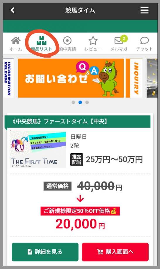 競馬タイムという競馬予想サイトが提供する競馬予想は、会員TOPページのメニュータブに「商品リスト」とあるので、ここをタップすると、競馬タイムの有料コース一覧を確認できる。