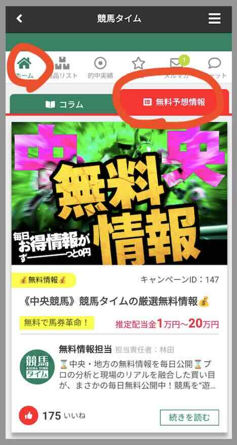 会員ページには「コラム」と「無料予想情報」という2つのタブが用意されており、このうち「無料予想情報」が競馬タイムの実際の無料予想にあたる。