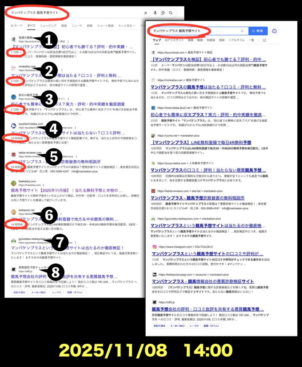 2025年11月8日の14時の時点で、「マンバケンプラス 競馬予想サイト」という複合キーワードで検索を行ったところ、すでに複数の情報サイトや検証サイトがGoogleにインデックス(検索エンジンに認識)されていることを確認した。