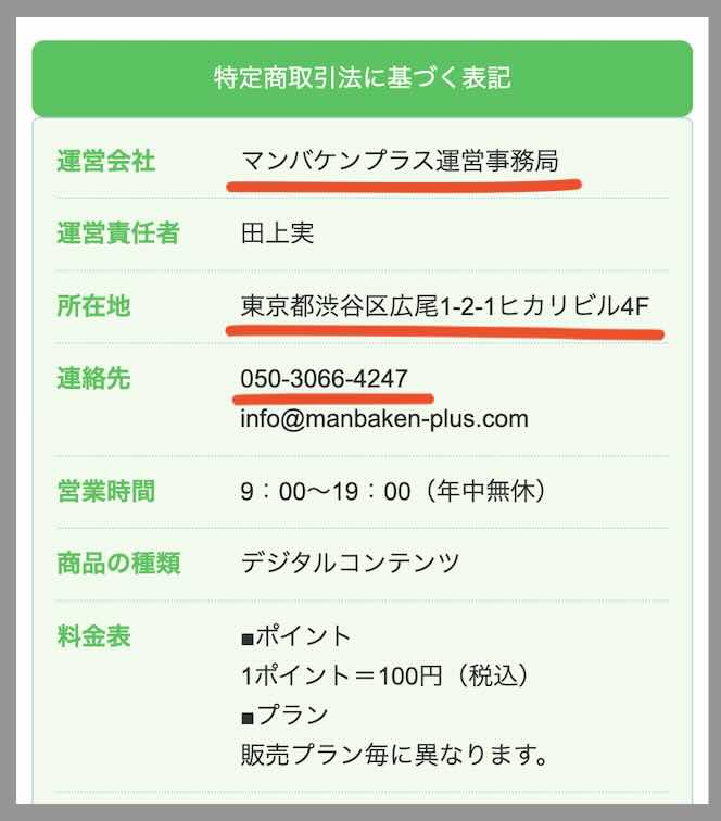 マンバケンプラスの「特定商取引法に基づく記載」には「マンバケンプラス運営事務局」と明記されているが、誰が見てもこの名称は法人格を示すものではなく、一般的な企業登記名とも異なる。