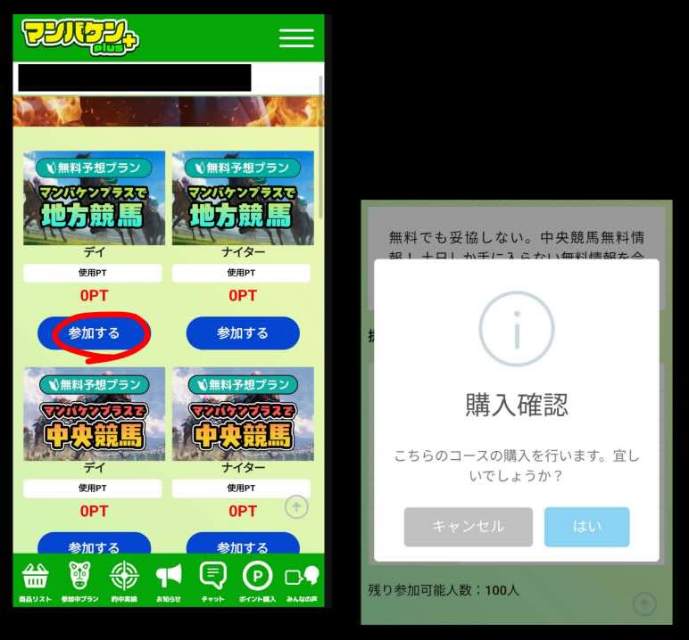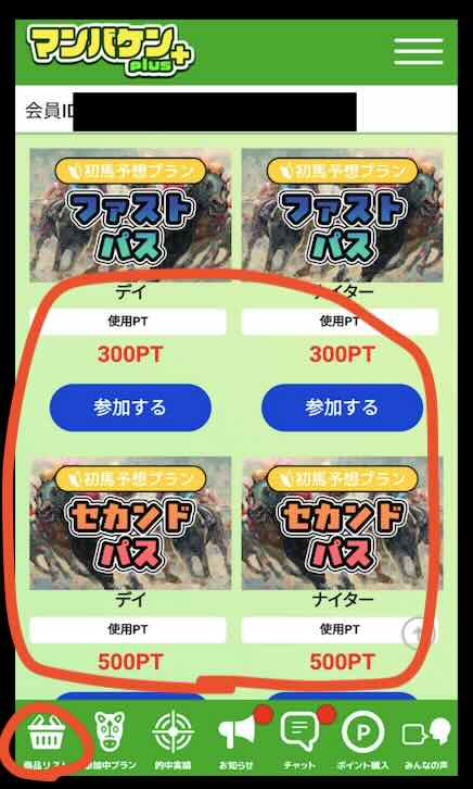 次のページで確認できる販売コース一覧ページの一番上に「無料予想プラン」とあるので、これがマンバケンプラスの無料予想だ。