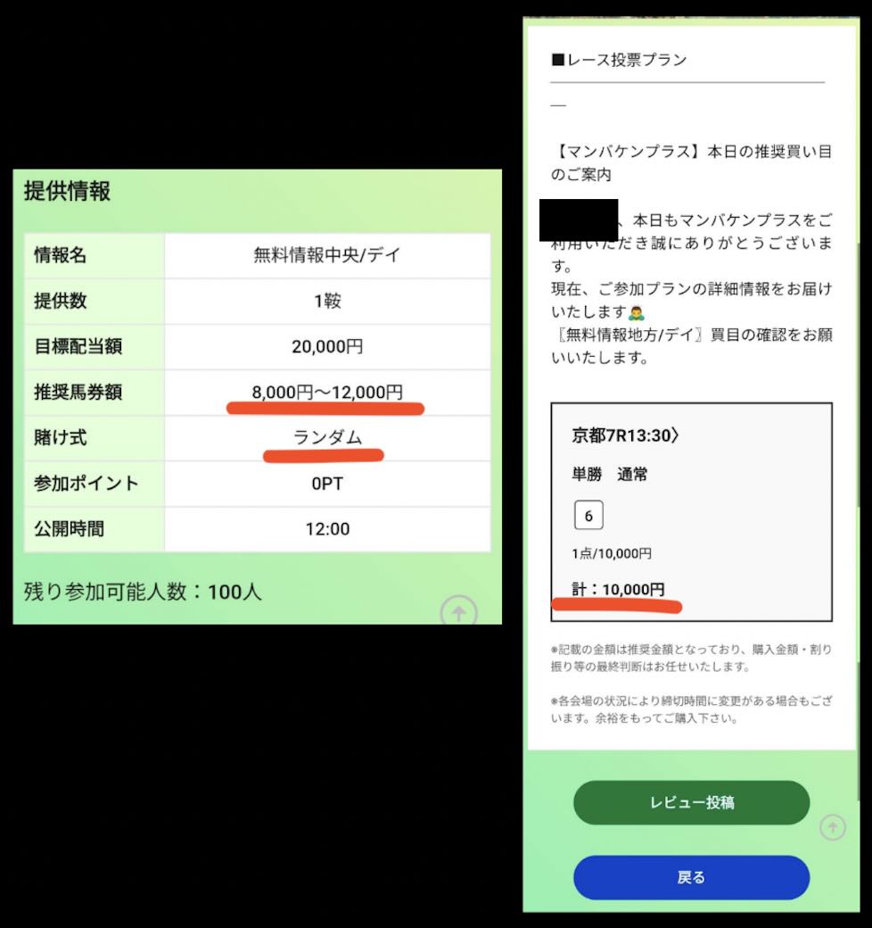 マンバケンプラスで提供される無料予想(無料情報)の内容は、1日1レースの提供となり、券種は基本的にランダムの提供となる。