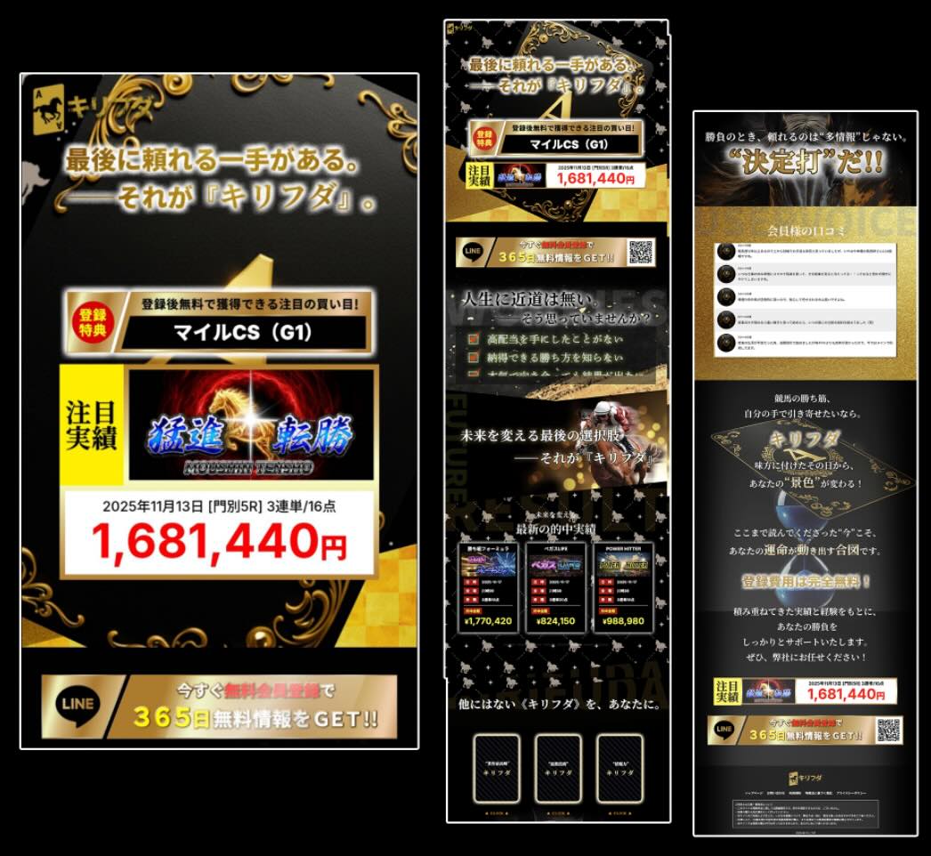 このデザインテイストは、グループサイトと考えられる「最上式勝馬投票券」や「本命」などの競馬予想サイトとよく似ており、キリフダも同系列の一角として位置づけられる可能性が高い。