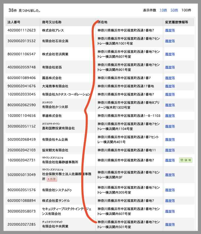 「キリフダ」の「特商法に基づく表記」では部屋番号が記載されていない一方で、国税庁サイトで住所を確認すると、複数の法人が同じ住所を使用しており、住所の後に「セントレー横浜関内◯◯号」が続く形で登録されていることが分かる。