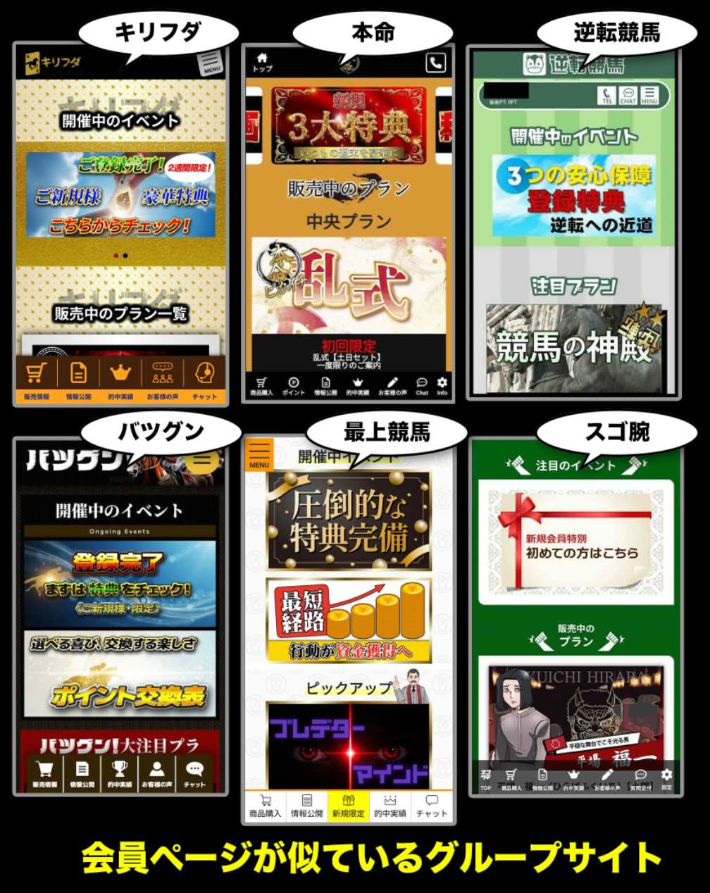 「キリフダ」の会員ページを確認すると、グループサイトとしてソースを比較した「本命」や、その他の会員サイトと非常に近い構造で作られていることが分かる。