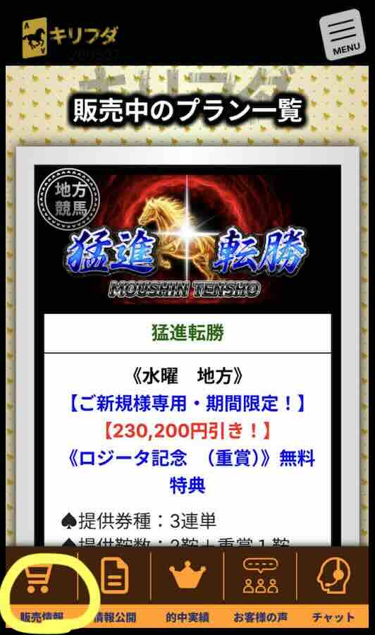 キリフダが販売している競馬予想は、会員ページのメニュータブの左端に「販売情報」とあるので、ここが「キリフダ」の有料情報一覧である。