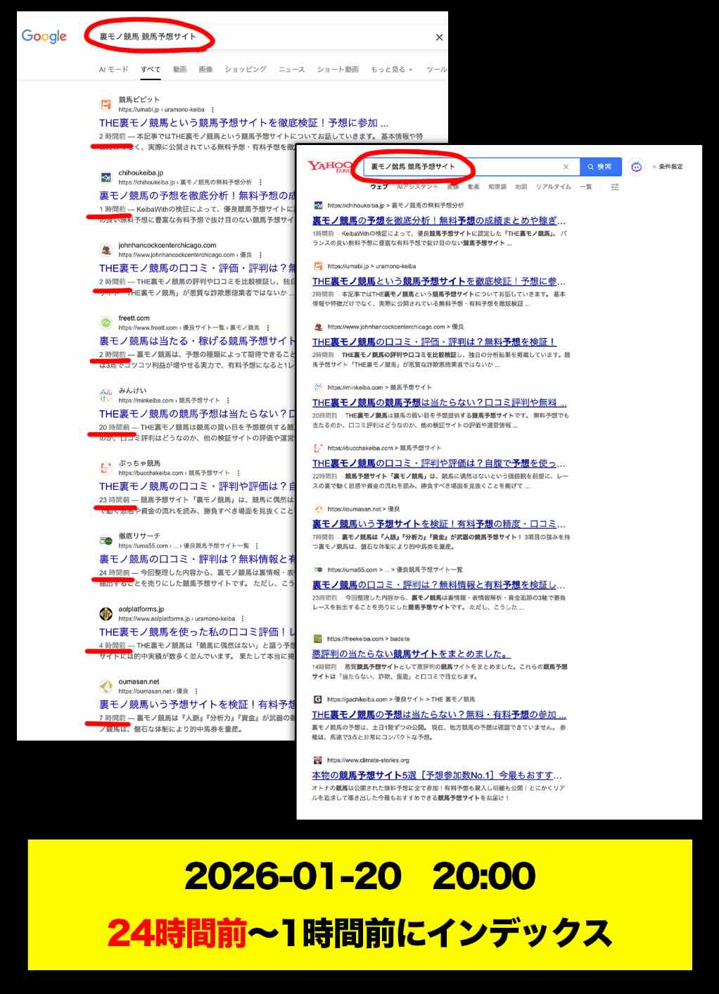 ところが、わずか2時間前にインデックスされたばかりの「ビビット」や、インデックスすら確認できない「競馬戦線」といった、同一運営と推測される外部集客サイトでは、すでに24日も前から裏モノ競馬の検証を開始していたことになっている。
