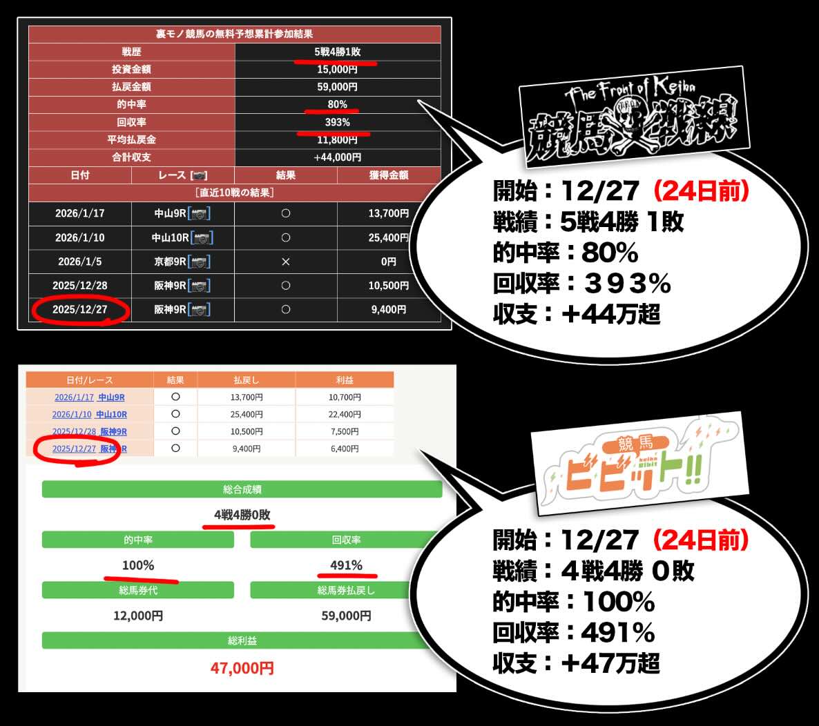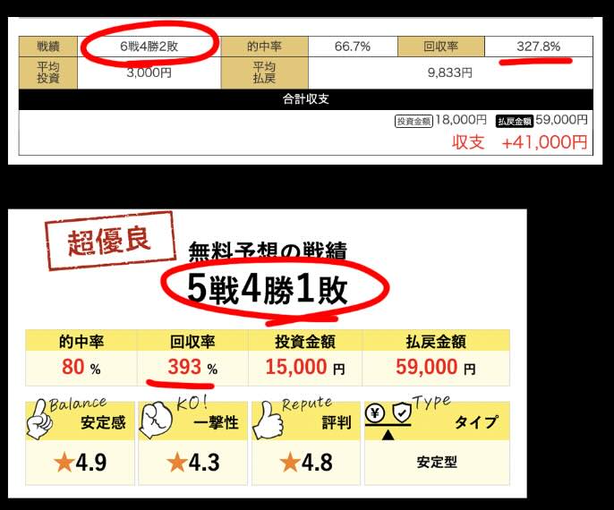 それらの検証結果として掲載されている戦績は、4戦4勝で的中率100%、あるいは5戦4勝で80%といった高い数値であり、回収率についても393%や491%と、事実であれば「優良サイト」と評価されて当然の内容が並んでいる。