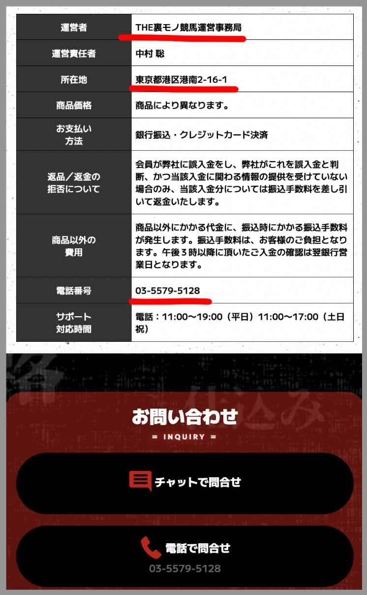 裏モノ競馬という競馬予想サイトの運営会社情報について調査したところ、フッターに記載された「特定商取引法に基づく記載」(上画像参照)では、当該サイトは「THE裏モノ競馬運営事務局」という「「運営者」が、競馬予想情報の販売を行っていると記載されている。
