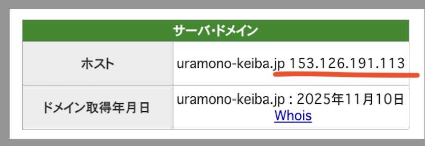裏モノ競馬のIPアドレス(送信元や送信先を特定するために使用される識別子)について確認したところ、「153.126.191.113」であることが判明した。
