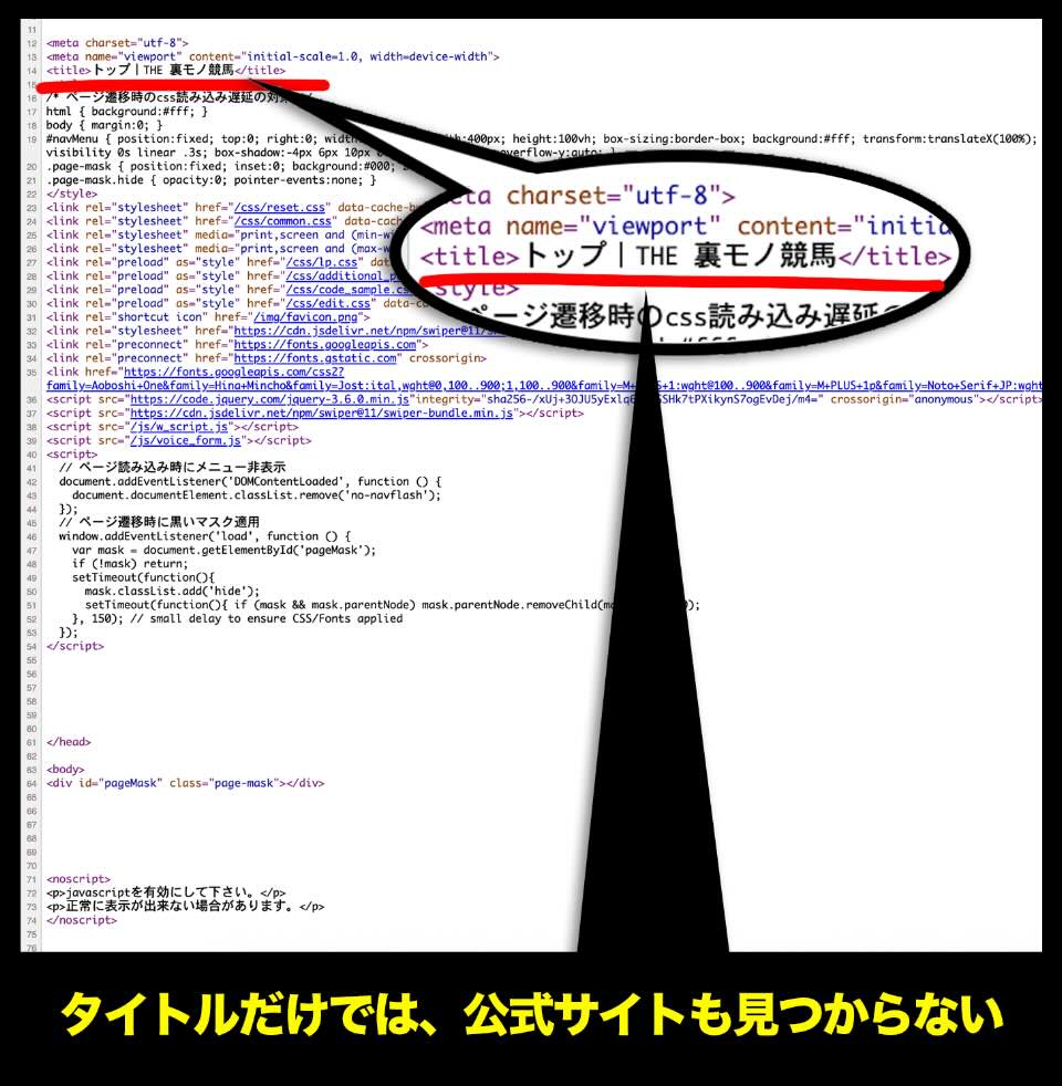 念のために裏モノ競馬のソースコードを確認してみたところ、サイト名以外に、Google検索に必要とされる有益な情報が一切記載されていない状態であることが確認できた。