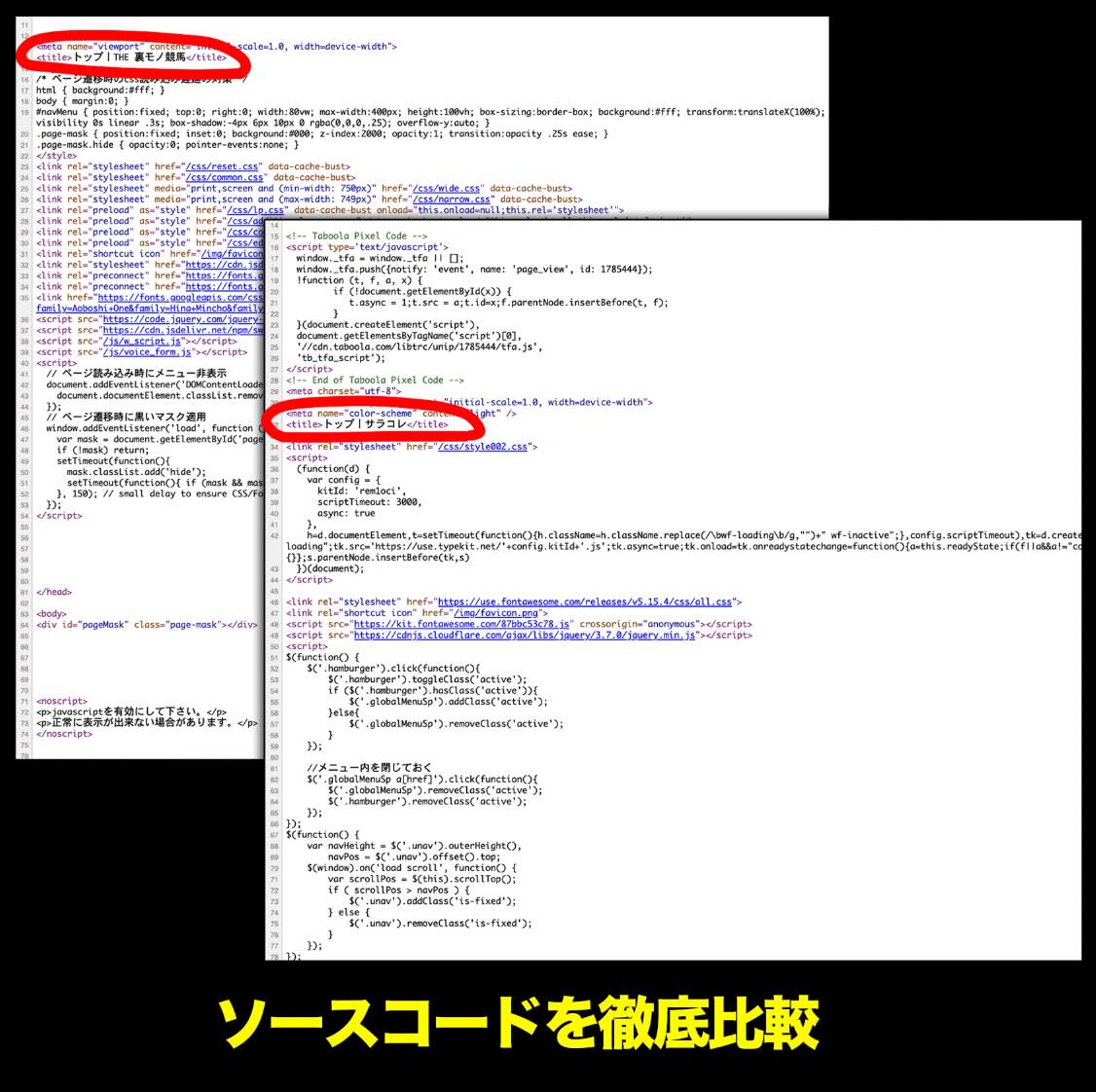 しかし実際に「競馬プロフェッショナル」のページソースと裏モノ競馬のソースコードを比較検証したところ、ルーティング構成や資産設計、導線の実装方法、JavaScriptの挙動など、基盤部分は明確に異なっており、決定打となる一致点は確認できなかった。