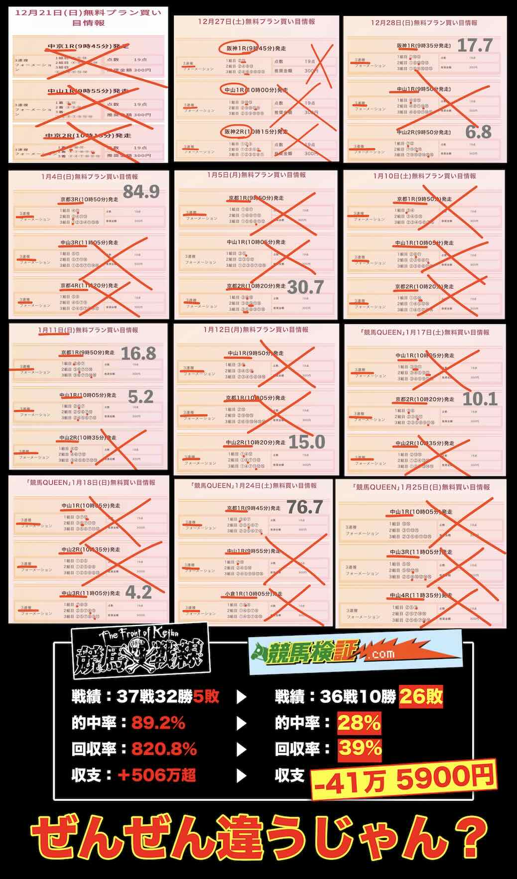 「カチケン」を紹介する一部の集客サイトでは、初期段階から収支が100万円を超えたとする高評価が掲載されていた。これに対し、「競馬検証.com」が独自に無料予想を12レース分検証したところ、以下の結果が得られた。
