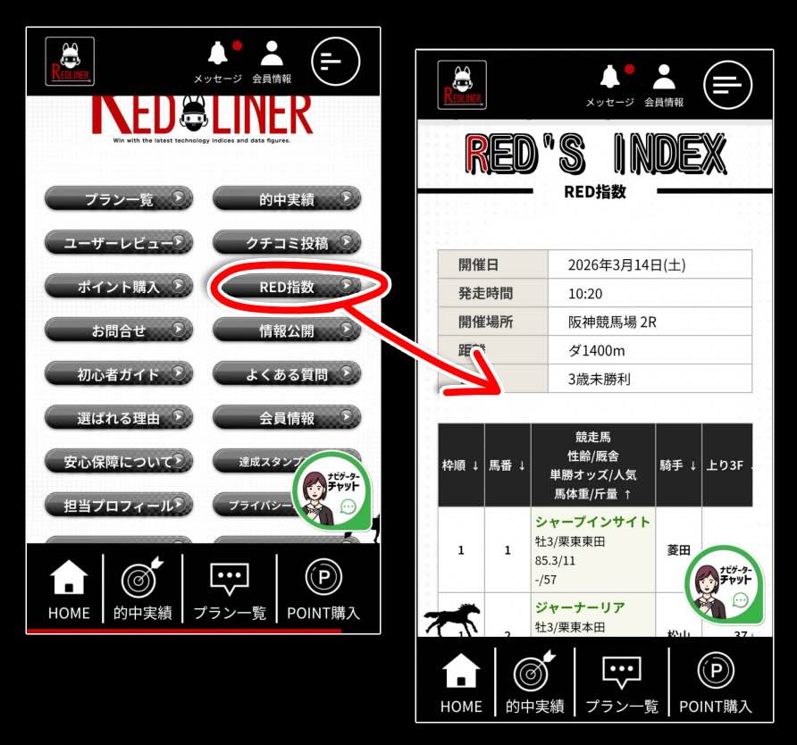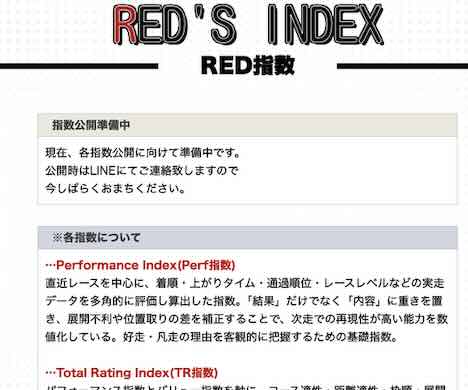競馬レッドライナーの提供する、無料予想(無料情報)だが、競馬レッドライナーのTOPページを下まで降りると「RED指数」と記載されたボタンがあるので、買い目の公開時刻になったらボタンを押すと、確認ができる。