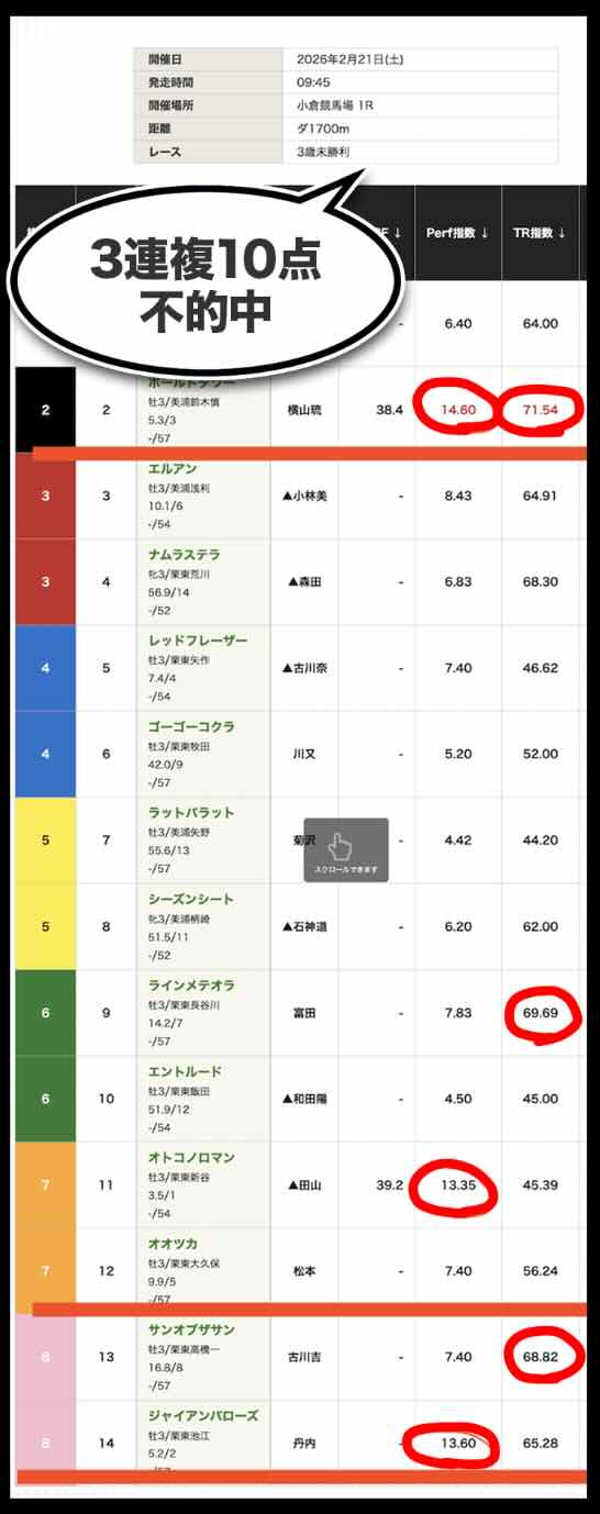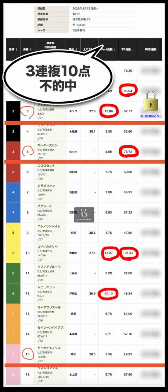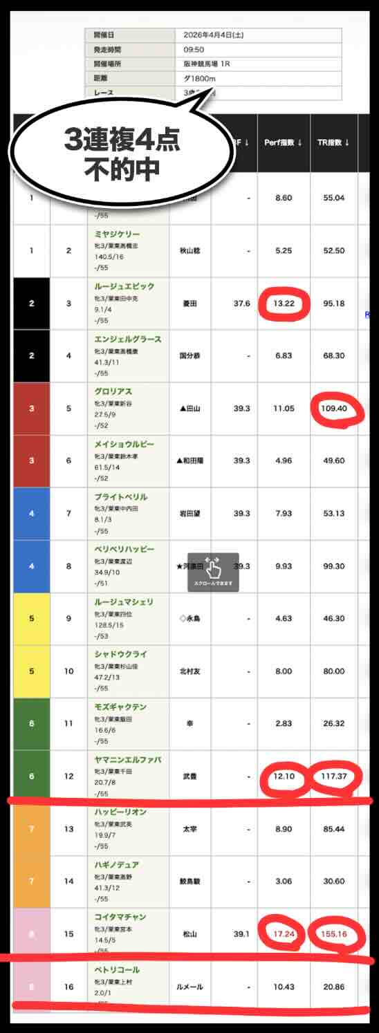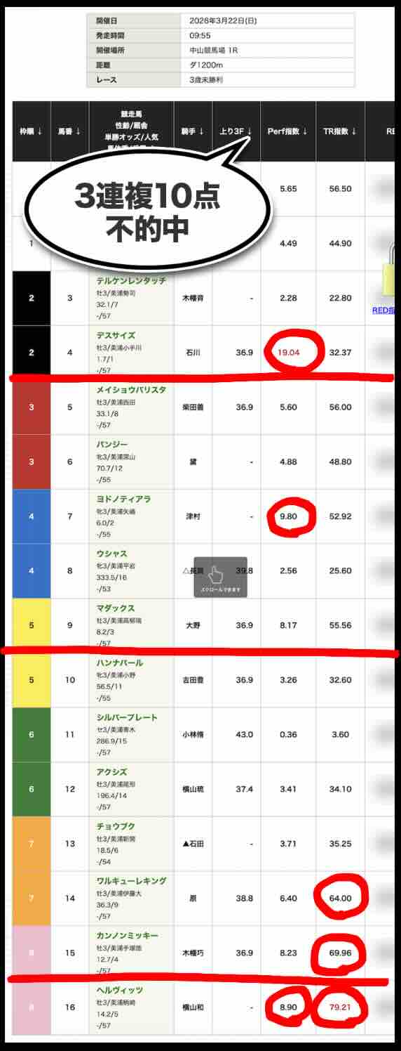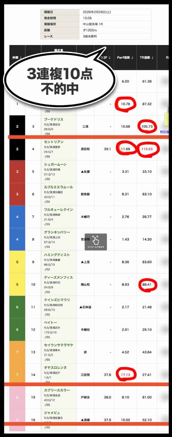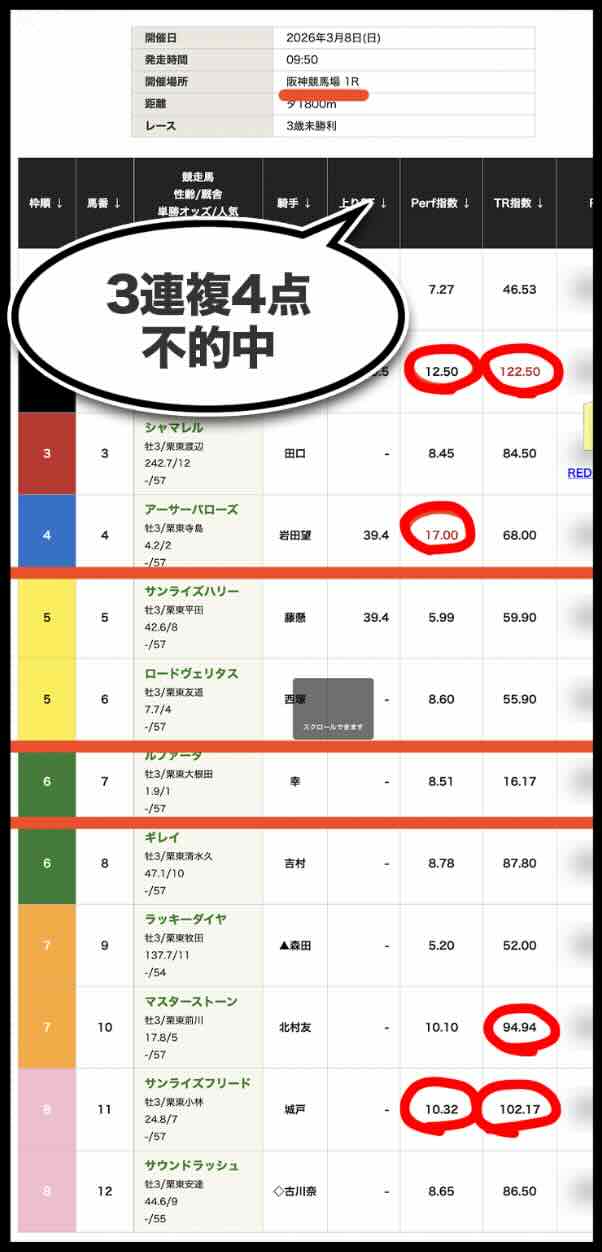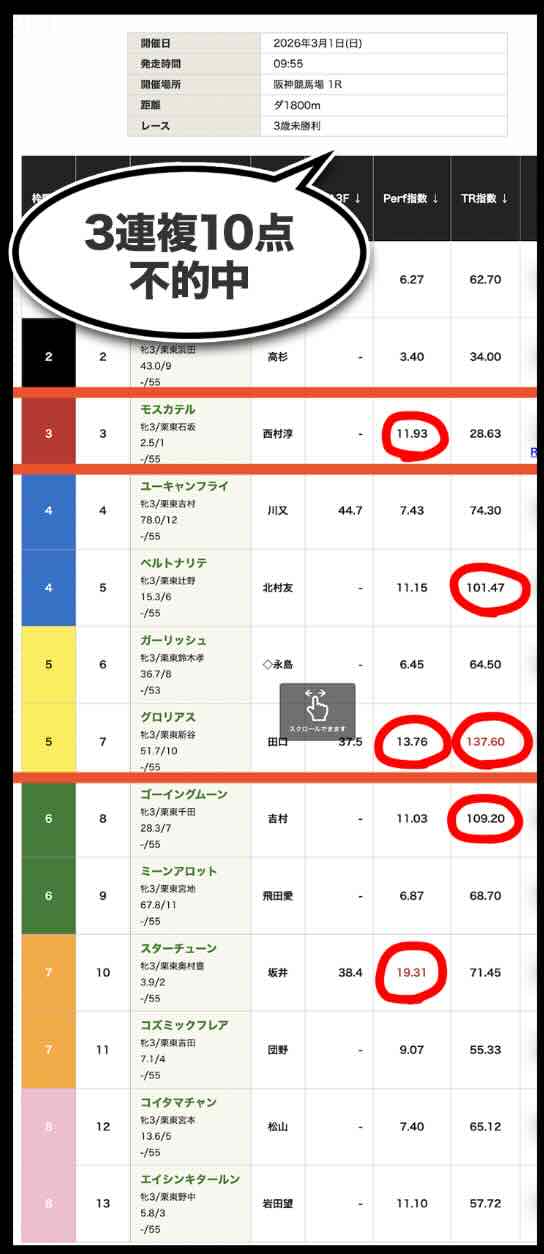 「Perf指数」「TR指数」ともに数値の提示に留まり、展開・位置取り・適性といった競馬の本質的要素と結びついていない。その結果、「人気馬は拾えるが相手を外す」「穴も拾えない」という中途半端な精度に終始している。