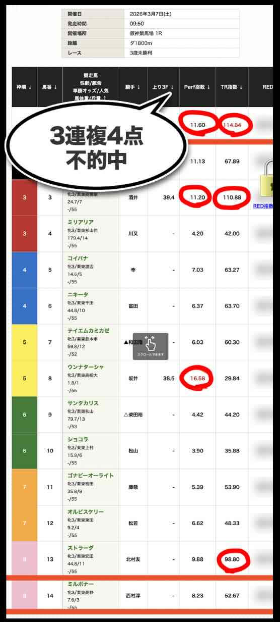 今回のレッドライナーの結果から見えてくるのは、「Perf指数」と「TR指数」が必ずしも「馬券を当てるための指標」として機能しているとは言い難いという点である。