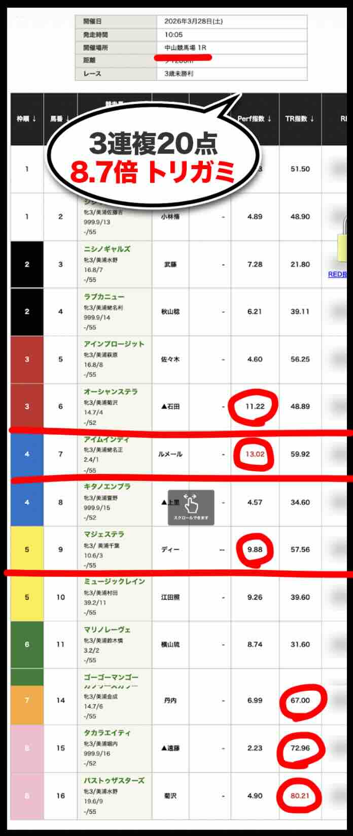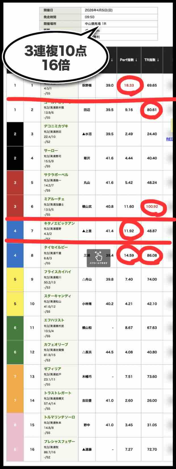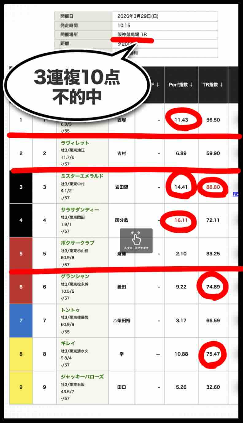 「Perf指数」トップでこれを拾えたのは当然である。むしろこの馬を外すようでは論外であり、「拾えて当然」の1頭に過ぎない。