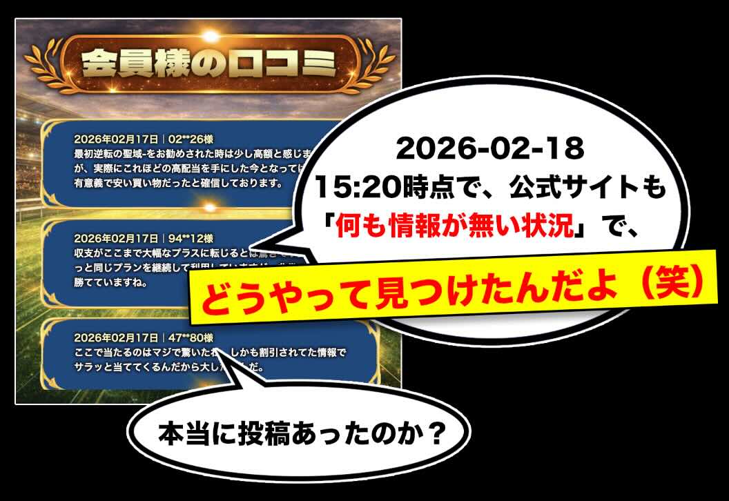 過去には、「身内の外部集客サイト」に公開を伝え、あたかも「以前から無料予想の検証を継続していた」かのように見える集客ページを作成し、運営と外部サイトの連動を疑わせる形で実績を強調していた——すなわち「作為的に整えられた形跡」と読まれても仕方がない表示が確認された事例も複数ある。